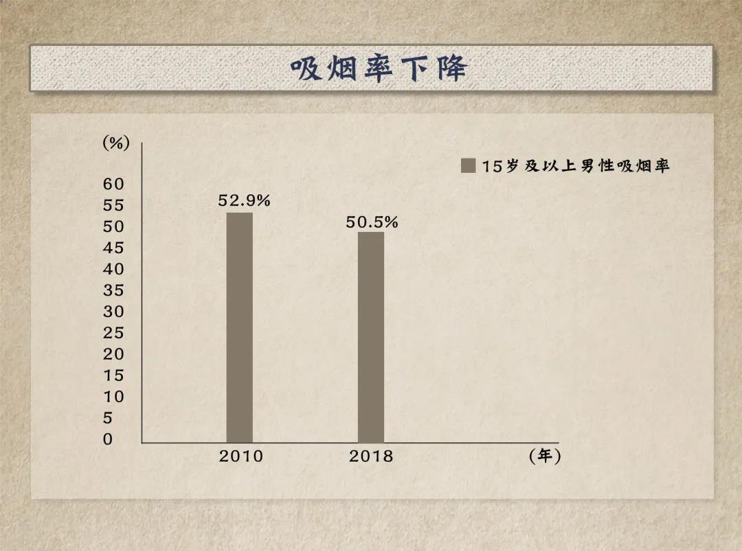 2010年至2018年,中國15歲及以上人群吸煙率呈下降趨勢,其中男性從52.9%降至50.5%。2018年,86.0%的人認(rèn)為吸煙會引起嚴(yán)重疾病。